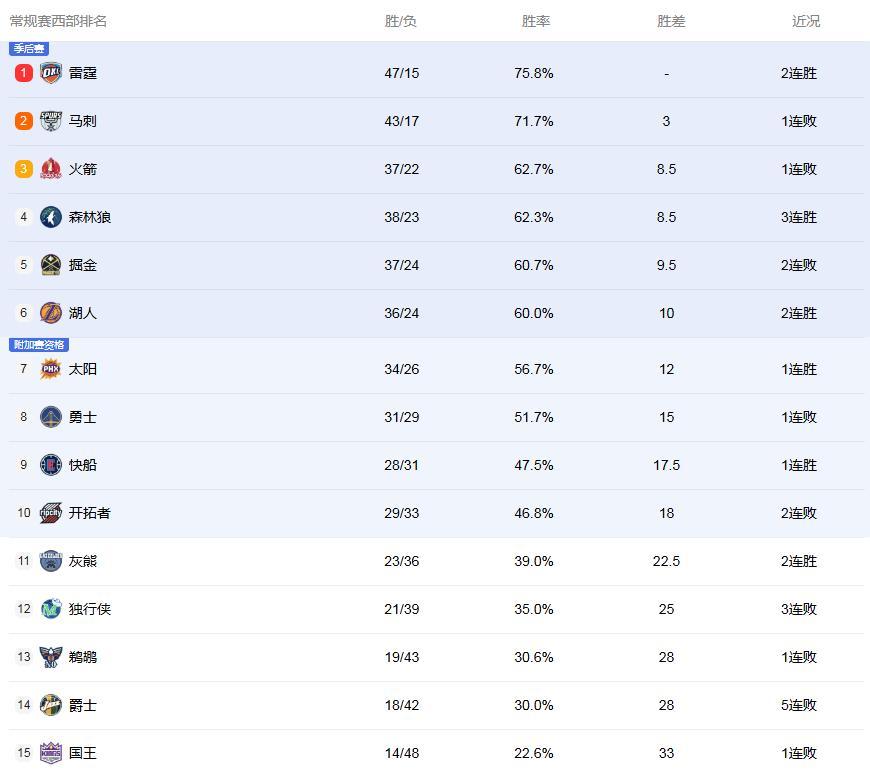 西部最新排名: