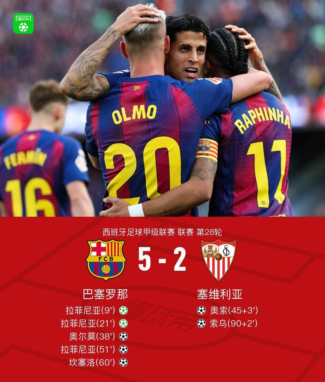第51分钟,拉菲尼亚折射破门上演帽子戏法,巴萨4-1塞维利亚